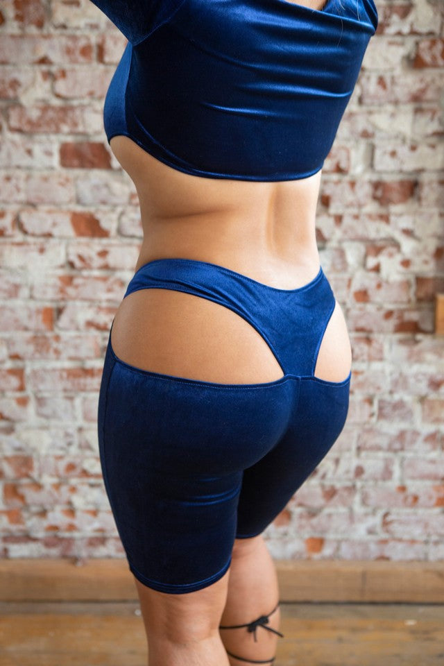 Half sleeve biker short romper with a squared zipper neckline completed with bold back and hip cut outs. This fun, sexy, sporty look can be paired best with stilettos or all white tennis shoes.